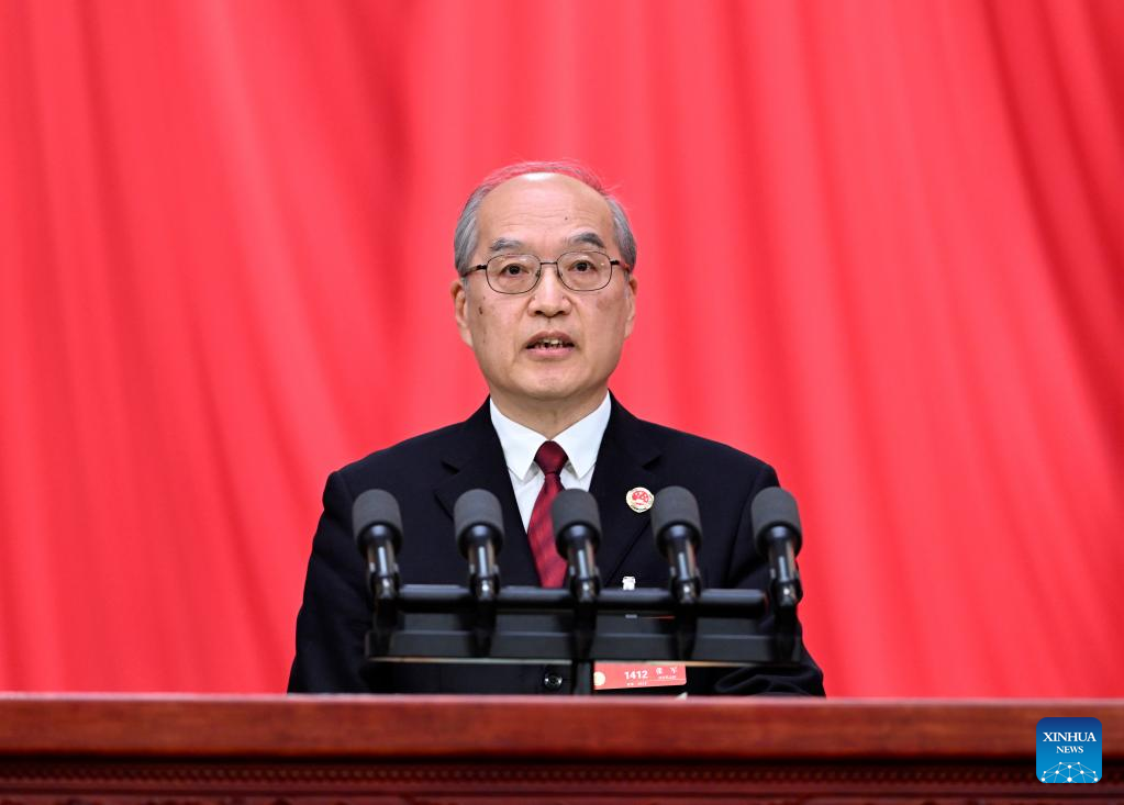 Zhang Jun, procurator-general of the Supreme People's Procuratorate (SPP), delivers a work report of the SPP at the second plenary meeting of the first session of the 14th National People's Congress (NPC) at the Great Hall of the People in Beijing, capital of China, March 7, 2023. (Xinhua/Yan Yan)
