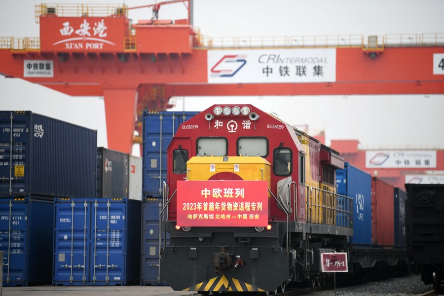 A China-Europe freight train loaded with 1,300 tonnes of flour from Kazakhstan arrives at Xi'an International Port in Xi'an, northwest China's Shaanxi Province, Jan. 13, 2023. (Xinhua/Li Yibo)