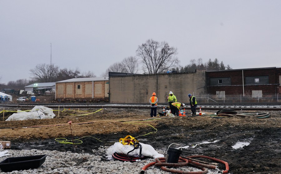 Workers drain contaminated water on the site of the Feb. 3 derailment on the outskirts of the village of East Palestine, Ohio, the United States, on Feb. 14, 2023. (Photo by Phil Zhang/Xinhua)