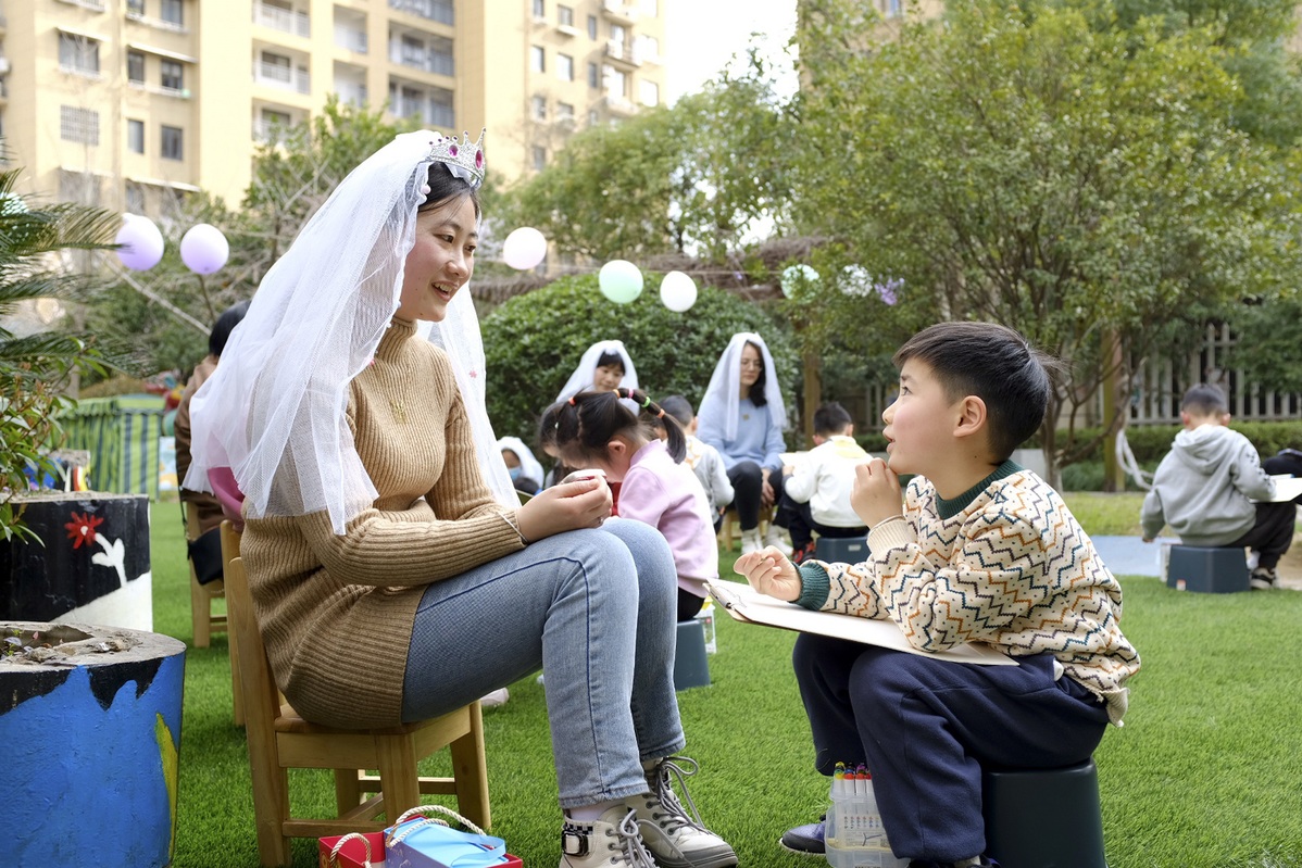 Children sketch their mothers at a kindergarten in Tonglu, Zhejiang on March 7, 2023. [Photo by Xu Junyong/For chinadaily.com.cn]