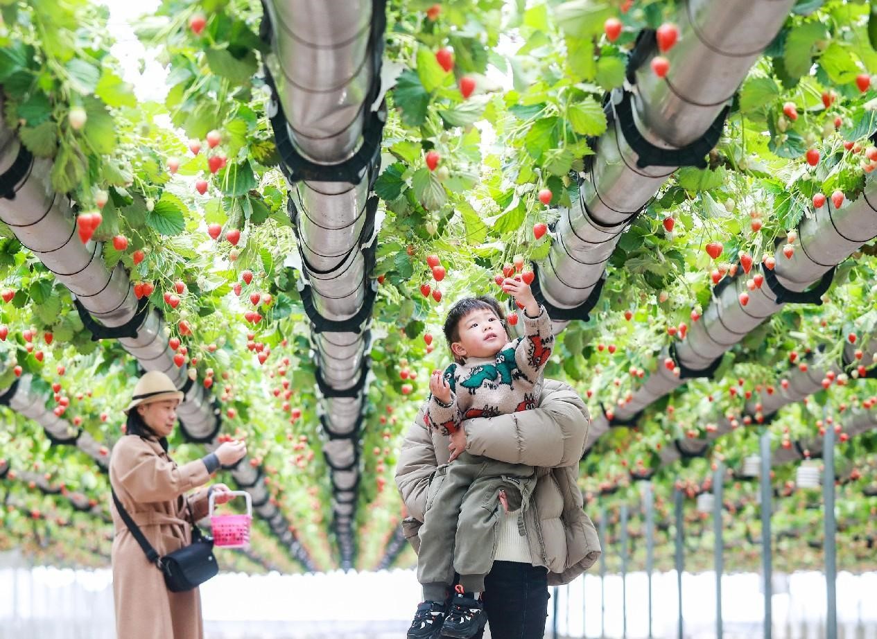 Photo shows residents picking strawberries in a planting base in Huangyan district, Taizhou, east China's Zhejiang province. (People's Daily Online/Sun Jinbiao)