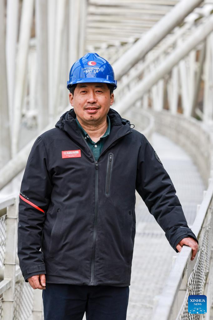 Jiang Peng walks past the FAST during its maintenance period in Pingtang County, southwest China's Guizhou Province, Feb. 13, 2023. China's Five-hundred-meter Aperture Spherical Radio Telescope (FAST), the world's largest single-dish radio telescope, is located in Pingtang County of southwest China's Guizhou Province. Jiang Peng, a deputy to the 14th National People's Congress (NPC) and chief engineer of the FAST, fulfilled the adjusting mission of the telescope with his team members and made its comprehensive capability reach the world's leading level. (Xinhua/Ou Dongqu)