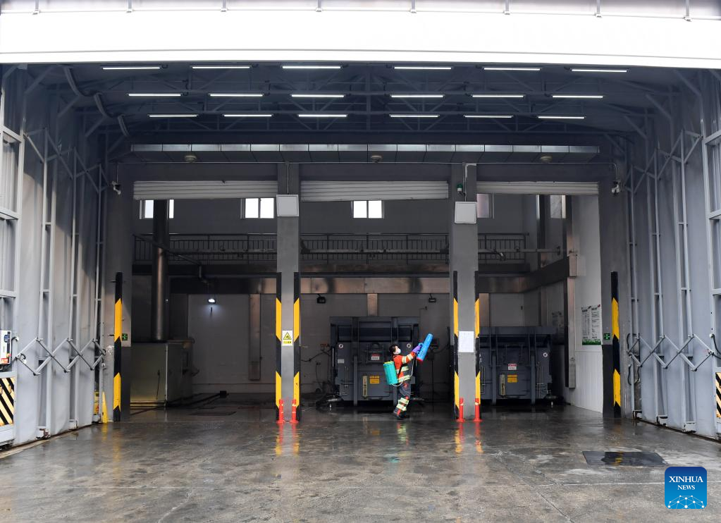 Liu Mingqun cleans equipment at a garbage station in Shijingshan District of Beijing, capital of China, Feb. 17, 2023. (Xinhua/Zhang Chenlin)