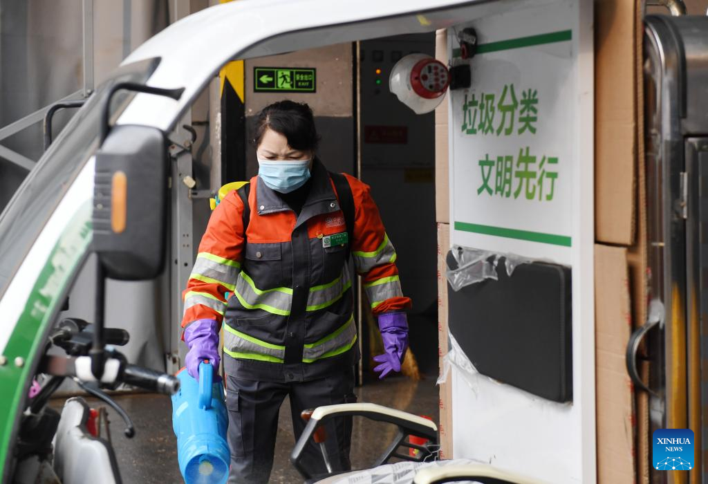 Liu Mingqun disinfects the garbage station she is responsible for in Shijingshan District of Beijing, capital of China, Feb. 17, 2023. (Xinhua/Zhang Chenlin)
