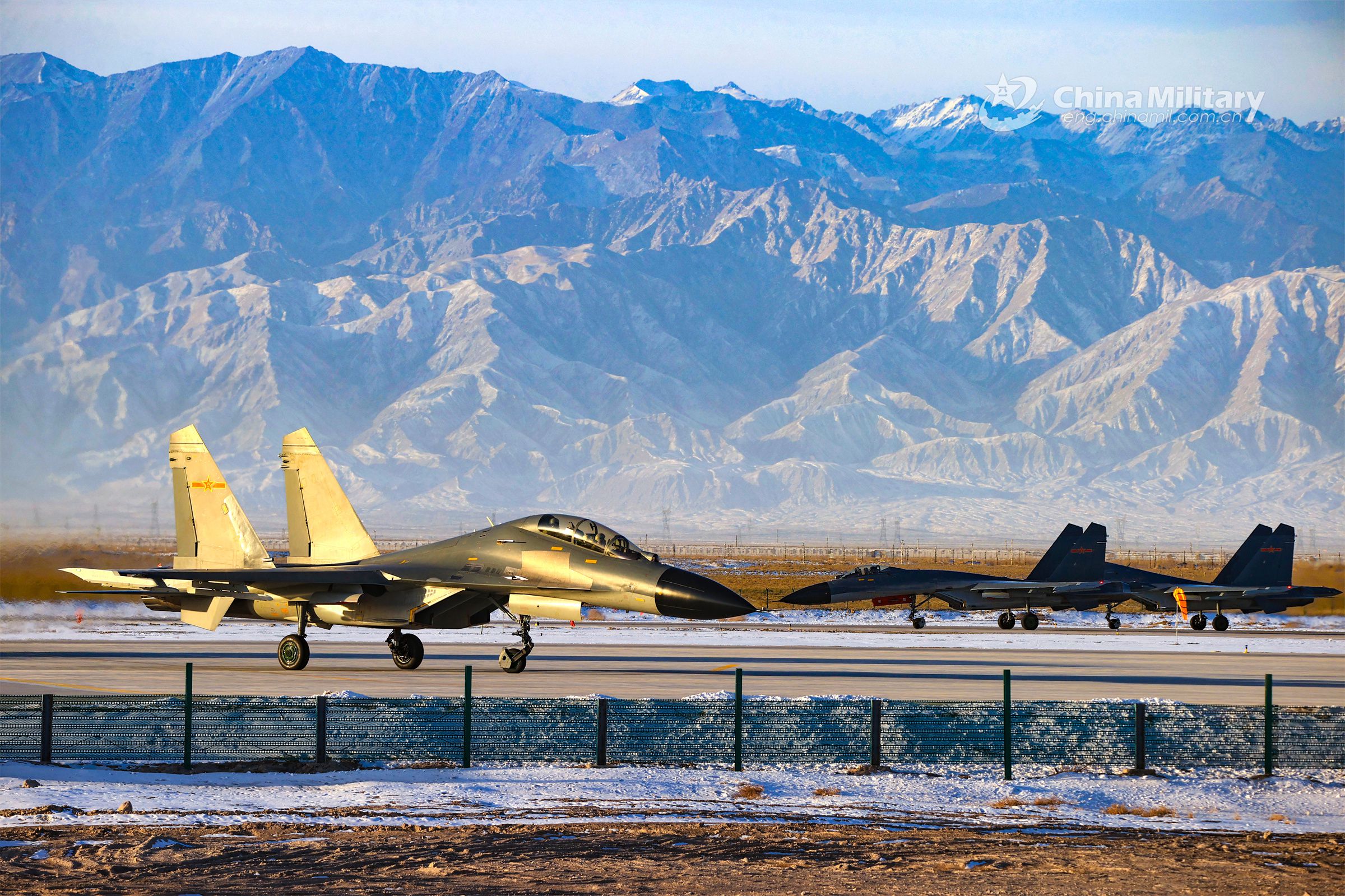 Fighter jets attached to an aviation brigade of the Air Force taxi on the runway before takeoff for a high-intensity flight training exercise in early February, 2023. (eng.chinamil.com.cn/Photo by Cui Baoliang)