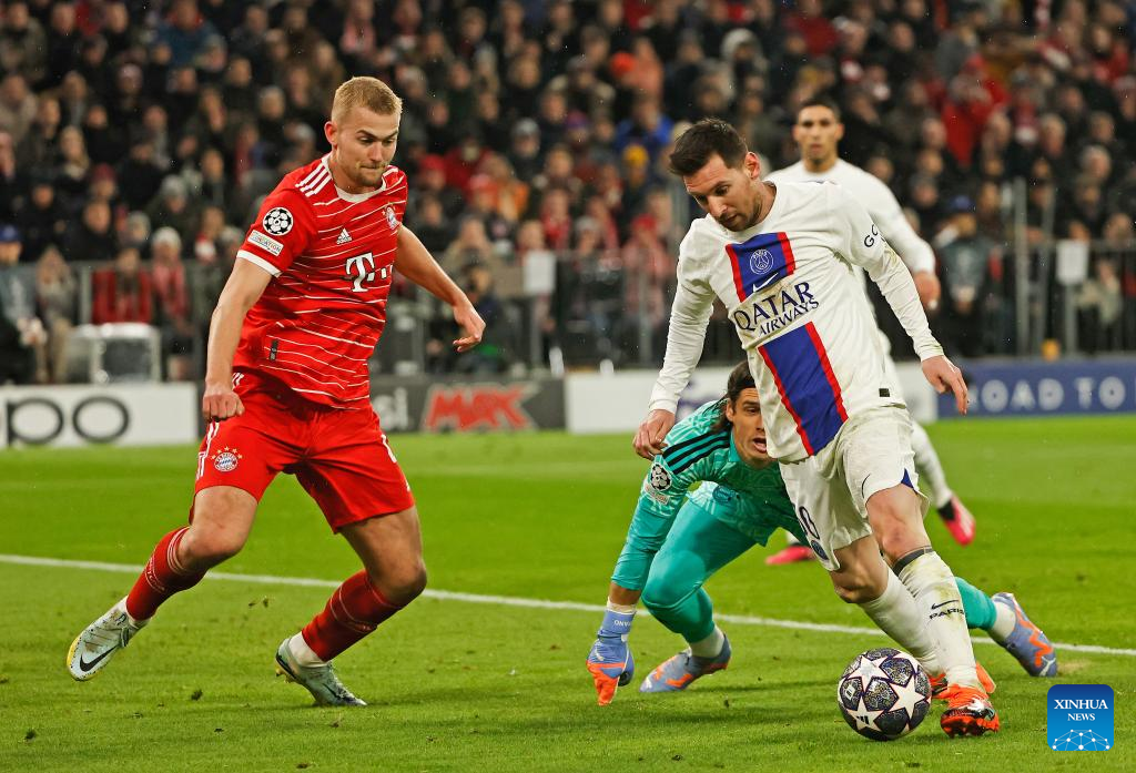 Lionel Messi (R) of Paris Saint-Germain breaks through during the UEFA Champions League round of 16 second leg football match between Bayern Munich and Paris Saint-Germain in Munich, Germany, on March 8, 2023. (Photo by Philippe Ruiz/Xinhua)