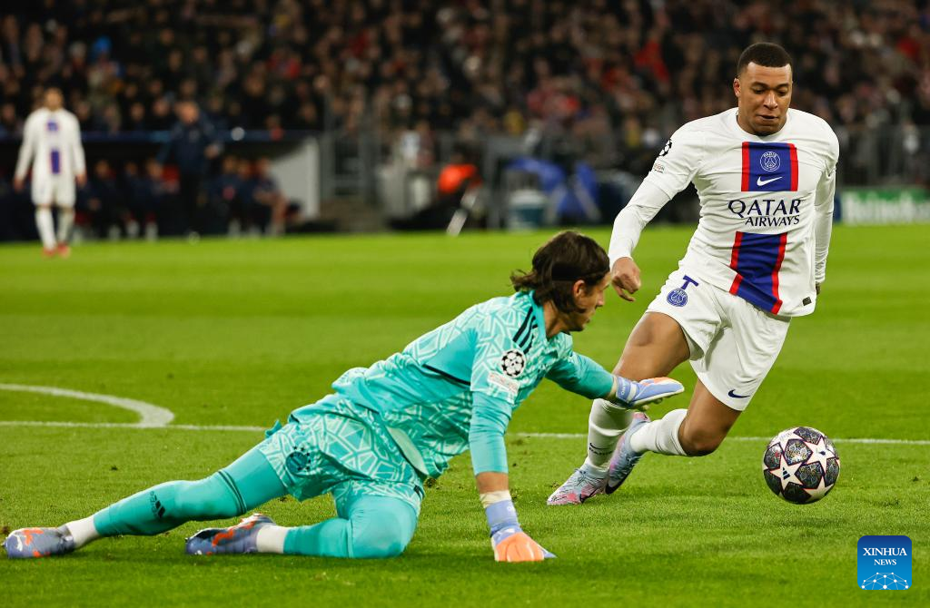 Bayern Munich's goalkeeper Yann Sommer (L) vies with Kylian Mbappe of Paris Saint-Germain during the UEFA Champions League round of 16 second leg football match between Bayern Munich and Paris Saint-Germain in Munich, Germany, on March 8, 2023. (Photo by Philippe Ruiz/Xinhua)