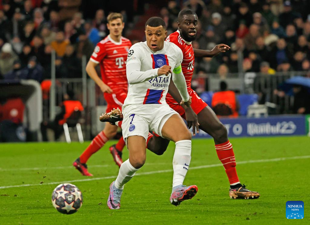 Kylian Mbappe (front) of Paris Saint-Germain competes during the UEFA Champions League round of 16 second leg football match between Bayern Munich and Paris Saint-Germain in Munich, Germany, on March 8, 2023. (Photo by Philippe Ruiz/Xinhua)