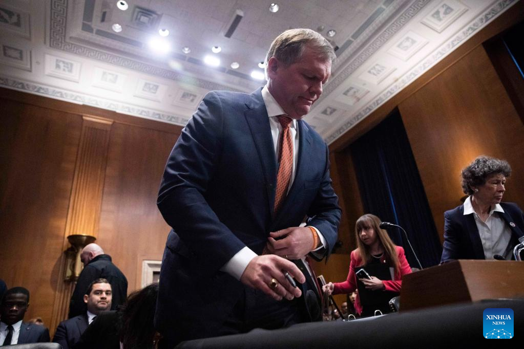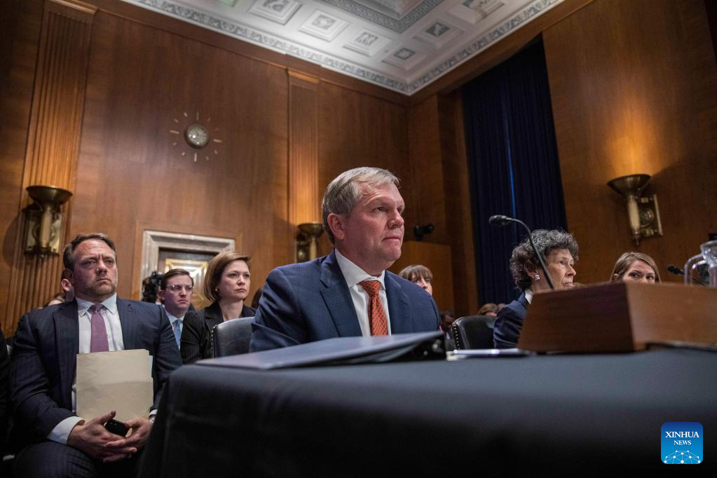 Norfolk Southern CEO Alan Shaw testifies at a hearing before the Senate Environment and Public Works Committee on protecting public health and the environment in the wake of the Norfolk Southern train derailment and chemical release in East Palestine, Ohio in Washington, D.C., the United States, March 9, 2023. The chief executive of U.S. transportation company Norfolk Southern said on Thursday that he's "deeply sorry" for the impact of the train derailment in East Palestine, Ohio, in early February. Local residents, meanwhile, are demanding more action. (Photo by Aaron Schwartz/Xinhua)