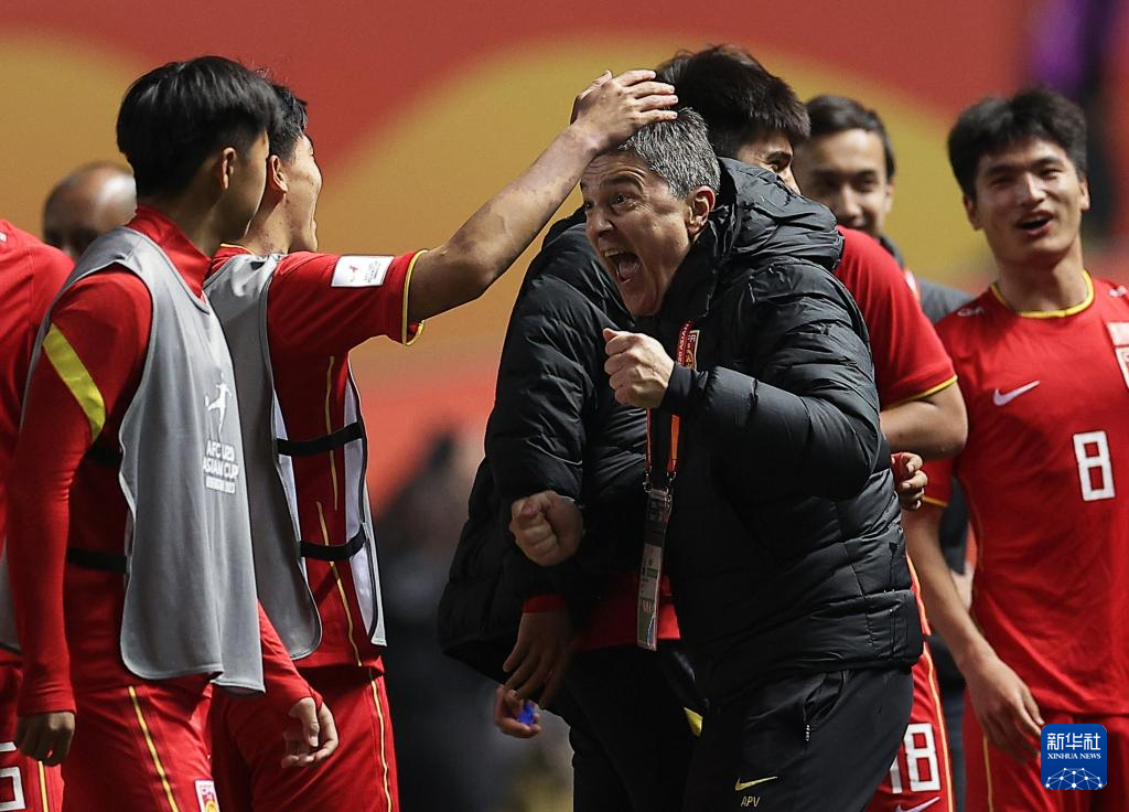 Head coach Antonio Puche Vicente (1st L) of China celebrates after winning the Group D match between China and Kyrgyzstan of AFC U20 Asian Cup in Tashkent, Uzbekistan, March 9, 2023. (Photo by Che Zhouyong/Xinhua)