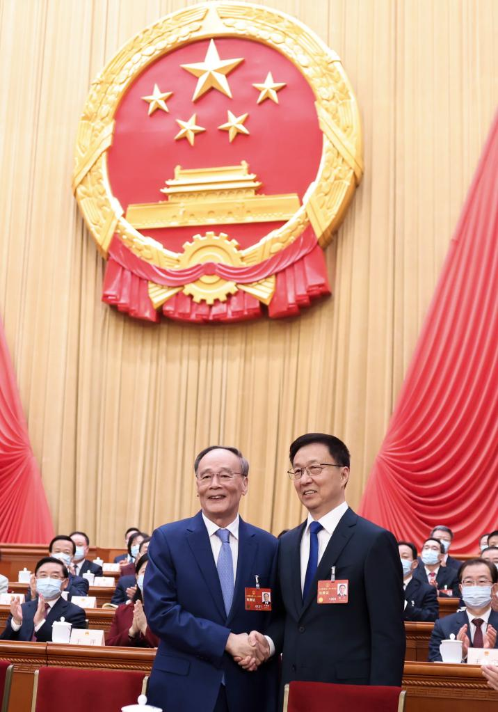 Han Zheng (R, front) shakes hands with Wang Qishan at the third plenary meeting of the first session of the 14th National People's Congress (NPC) at the Great Hall of the People in Beijing, capital of China, March 10, 2023. Han Zheng was elected Chinese vice president on Friday at the annual session of the national legislature. (Xinhua/Huang Jingwen)