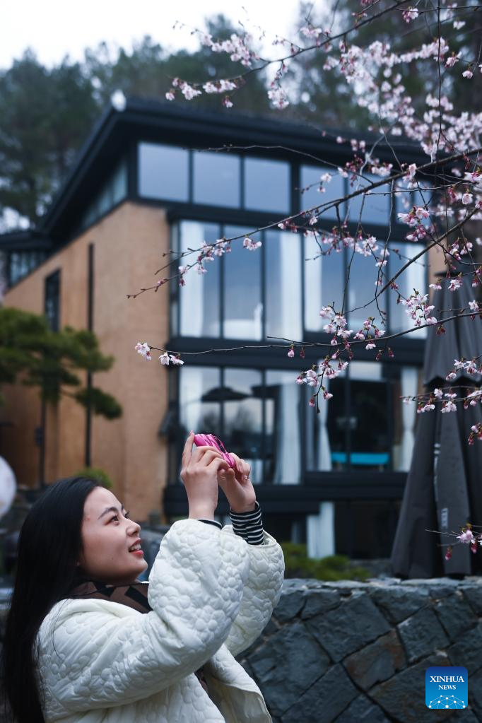 A tourist takes photos of cherry blossoms at a hostel in Qianyuan Village of Sandu Township, Jiande, east China's Zhejiang Province, Feb. 28, 2023. (Xinhua/Xu Yu)