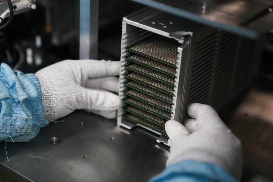 A staff member checks chip products at Nanjing V-Test Semiconductor Technology Co., Ltd. in Pukou Economic Development Zone of Nanjing, east China's Jiangsu Province, March 9, 2023. (Xinhua/Ji Chunpeng)
