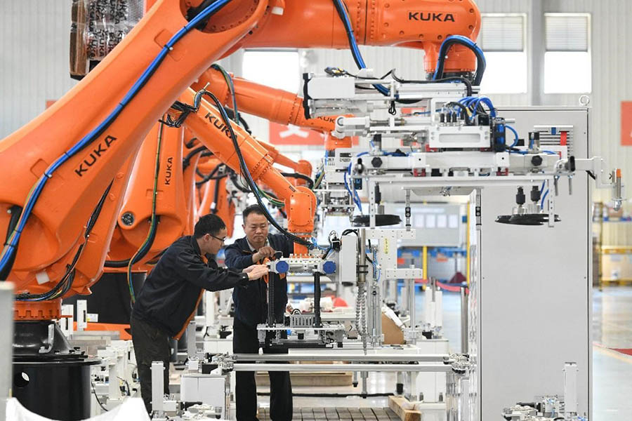 Workers debug robotic arms in a workshop of an intelligent equipment enterprise in Ningde, east China's Fujian province, March 8, 2023. (Photo by Wang Wangwang/People's Daily)