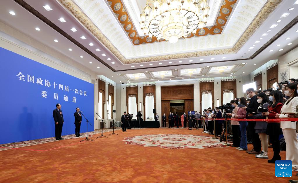 Members of the 14th National Committee of the Chinese People's Political Consultative Conference (CPPCC) are interviewed ahead of the closing meeting of the first session of the 14th CPPCC National Committee at the Great Hall of the People in Beijing, capital of China, March 11, 2023. (Xinhua/Chen Yichen)