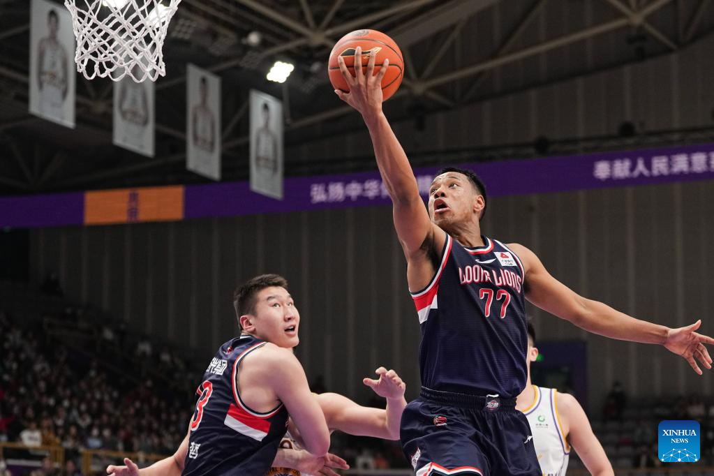 Nathaniel Mason (R) of Guangzhou Loong Lions goes for a lay-up during the 33rd round match between Beijing Royal Fighters and Guangzhou Loong Lions of 2022-2023 season of the Chinese Basketball Association (CBA) league in Beijing, capital of China, on March 11, 2023. (Xinhua/Ju Huanzong)