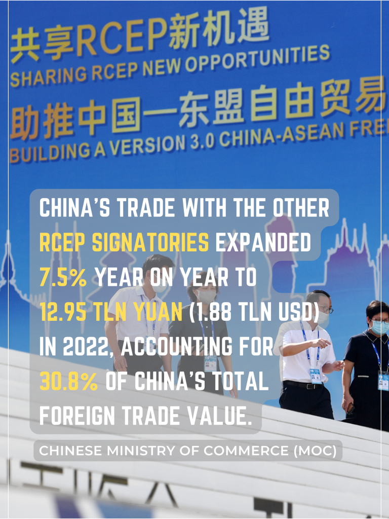 Drawing upon the RCEP, China has actively advanced free trade and endeavored to break down trade barriers among participating countries. Data from the Chinese Ministry of Commerce (MOC) showed that China's trade with the other RCEP signatories expanded 7.5 percent year on year to 12.95 trillion yuan (1.88 trillion U.S. dollars) in 2022, accounting for 30.8 percent of China's total foreign trade value.