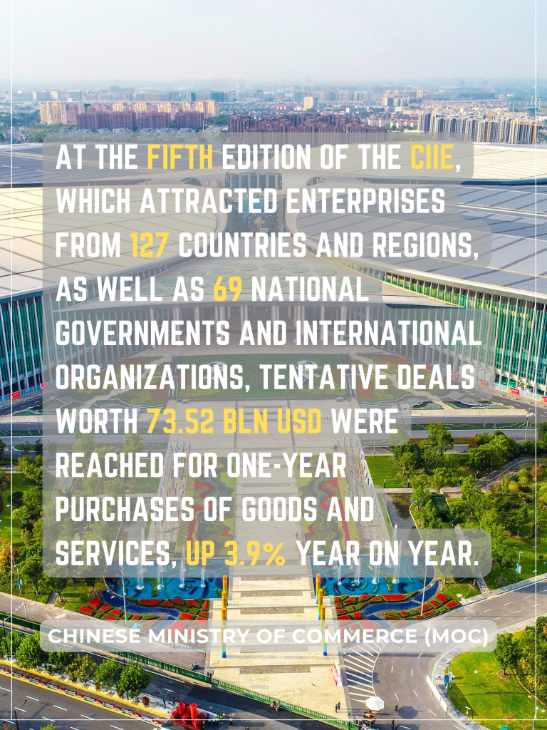 Data from the MOC showed that at the fifth edition of the CIIE, which attracted enterprises from 127 countries and regions, as well as 69 national governments and international organizations, tentative deals worth 73.52 billion dollars were reached for one-year purchases of goods and services, up 3.9 percent year on year. The event also offered more free booths for enterprises from the least developed countries.