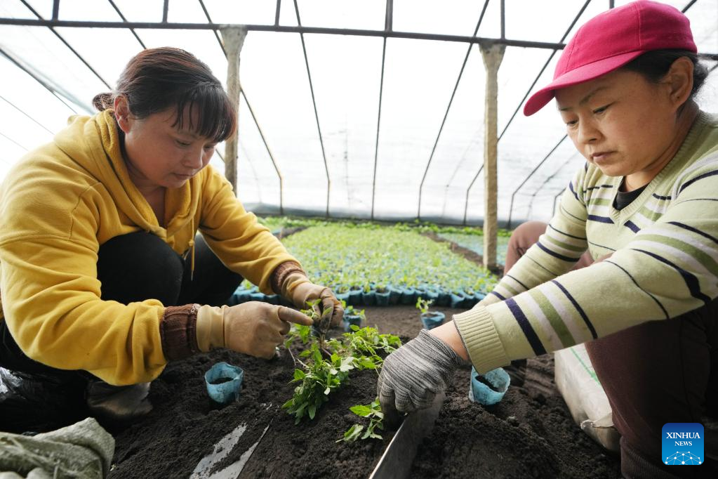 Villagers work at a greenhouse in Xingsheng Village of Ning'an Town, Ning'an City, Mudanjiang, northeast China's Heilongjiang Province, March 10, 2023. In Heilongjiang Province, though the temperature is still low in early spring, villagers are taking advantage of greenhouses to boost agricultural production efficiency and increase their income. (Xinhua/Wang Jianwei)