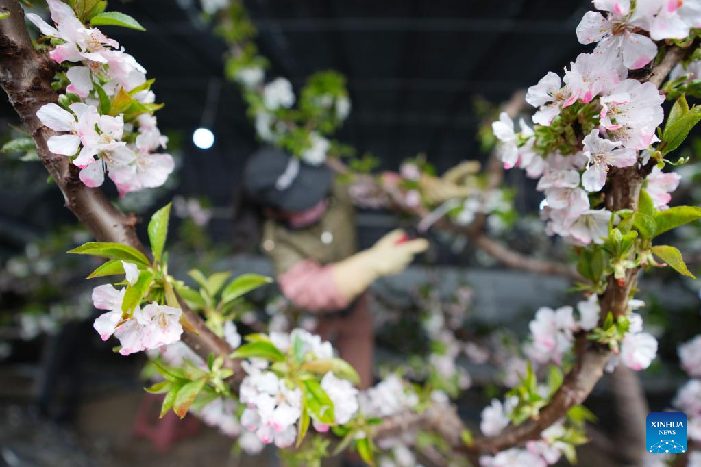 A staff member pollinates a cherry tree at a greenhouse in Jiamusi, northeast China's Heilongjiang Province, March 9, 2023. In Heilongjiang Province, though the temperature is still low in early spring, villagers are taking advantage of greenhouses to boost agricultural production efficiency and increase their income. (Xinhua/Wang Jianwei)