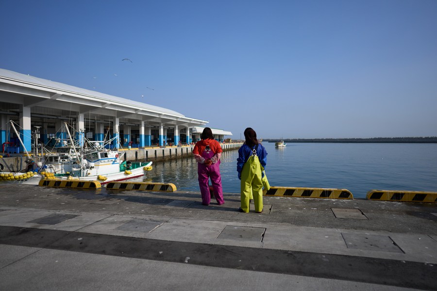 Fishermen wait for the return of fishing ships at the Haragama local distributor market in Soma city of Fukushima prefecture, Japan, March 8, 2023. (Xinhua/Zhang Xiaoyu)