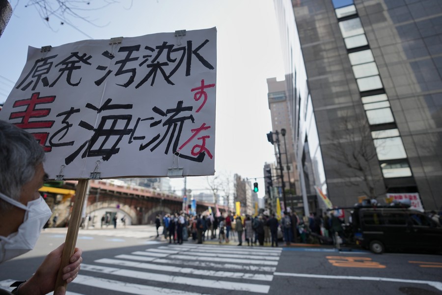 A sign that reads "do not dump contaminated wastewater into the sea" is pictured during a protest near the headquarters of Tokyo Electric Power Company (TEPCO) in Tokyo, Japan. (Xinhua/Zhang Xiaoyu)