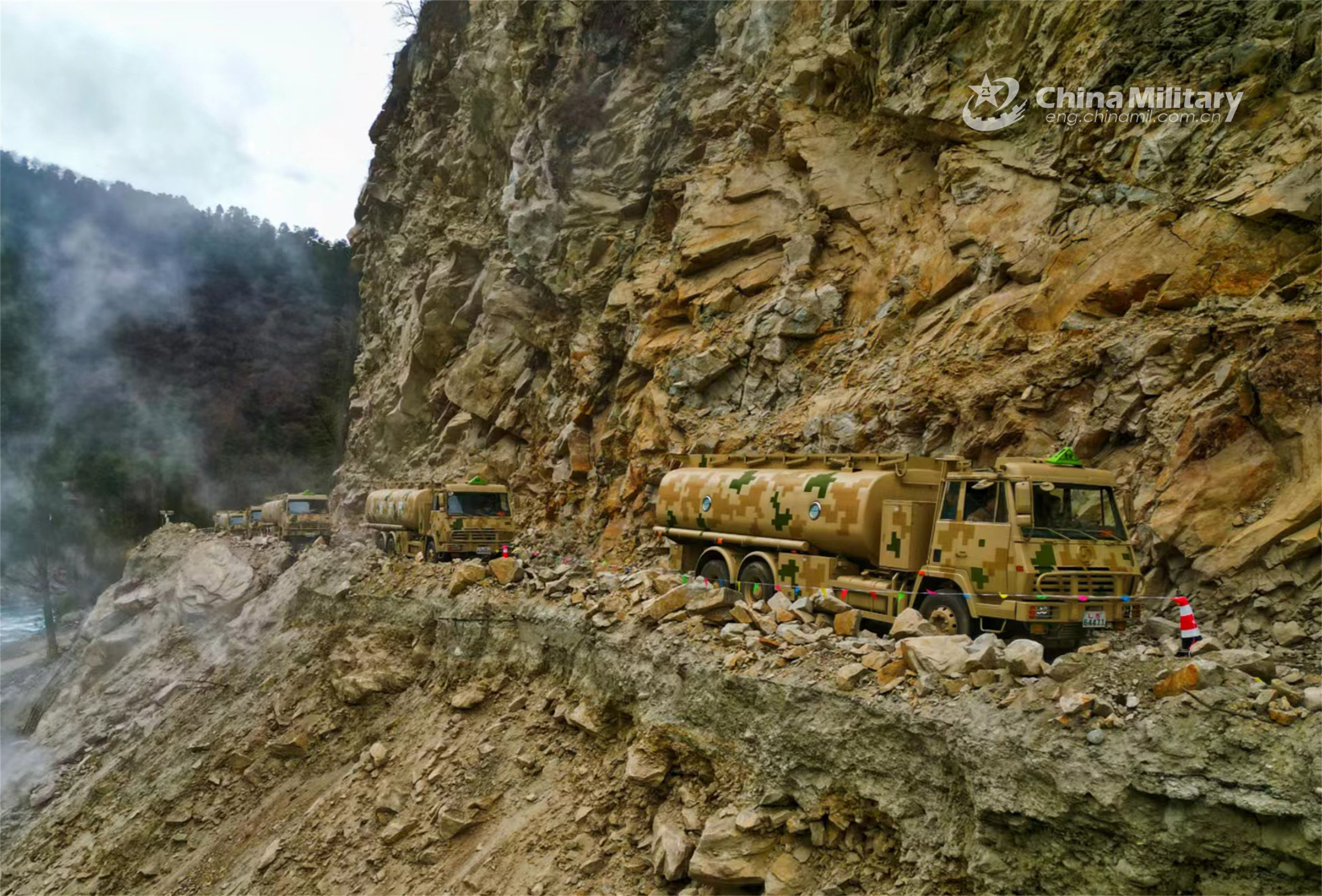 Tanker trucks attached to a brigade of the PLA Xizang Military Command pass through a landslide section on the maneuvering route during a POL transport task in late February, 2023. (eng.chinamil.com.cn/Photo by Li Zusong)