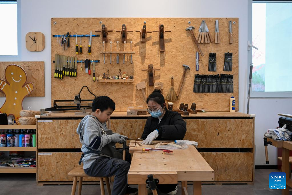 A child learns about woodcraft at the "eden Chunshanli" life demonstration area in Jizhou District, north China's Tianjin, March 11, 2023. (Xinhua/Sun Fanyue)