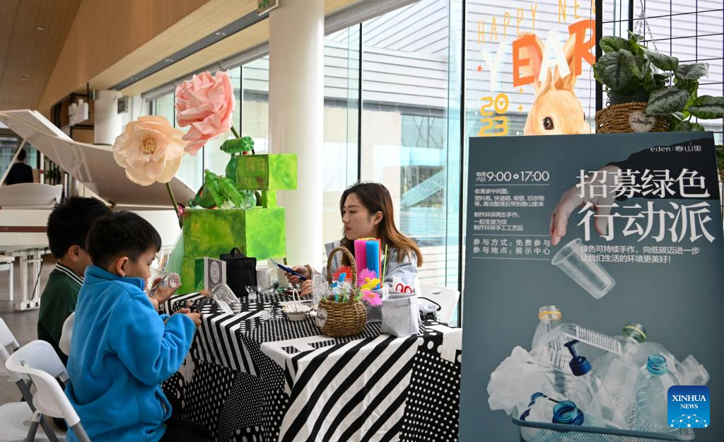 Children learn to make handicrafts out of recycled materials at the "eden Chunshanli" life demonstration area in Jizhou District, north China's Tianjin, March 11, 2023. (Xinhua/Sun Fanyue)