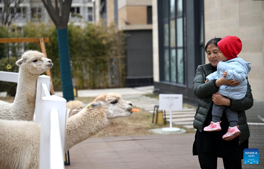 Visitors interact with alpacas at the "eden Chunshanli" life demonstration area in Jizhou District, north China's Tianjin, March 11, 2023. (Xinhua/Zhao Zishuo)