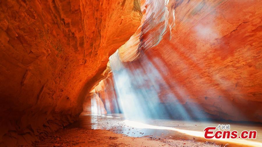Sunshine casts into the Ganquan canyon through the fissures, creating mysterious beauty at Ganquan County of Yan'an, northwest China's Shaanxi Province. Rain, water and wind over millions of years has sculpted its red sandstone into various textures and shapes. (Photo: China News Service/Bai Teng)