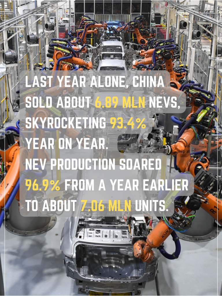 The new energy vehicle (NEV) industry is a fine illustration. Last year alone, China sold about 6.89 million NEVs, skyrocketing 93.4 percent year on year. NEV production soared 96.9 percent from a year earlier to about 7.06 million units. The market share of NEVs in China's auto market reached 25.6 percent in 2022, up 12.1 percentage points from 2021.