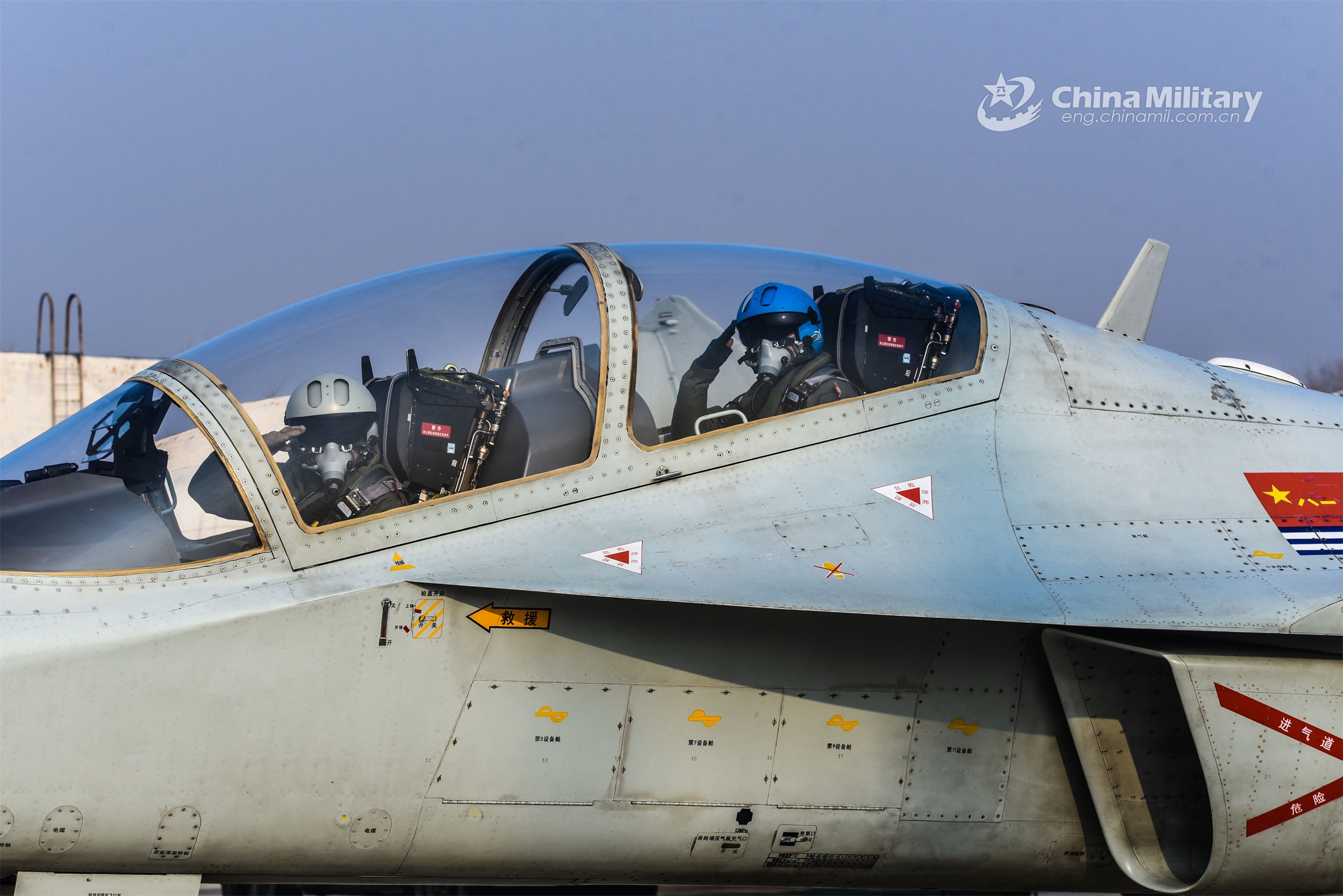 Two pilots assigned to a regiment of the Naval Aviation University salute to the ground crew during a flight training exercise in early February, 2023. (eng.chinamil.com.cn/Photo by Xu Yinglong)