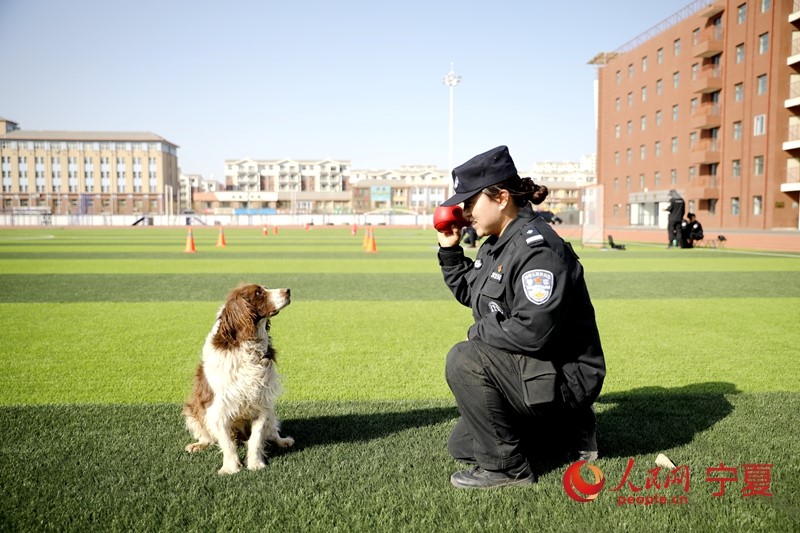 Photo shows Gao Wei, a policewoman with the public security bureau of Yinchuan city, northwest China's Ningxia Hui Autonomous Region, and her police dog. (People’s Daily Online/Yan Mengjie)