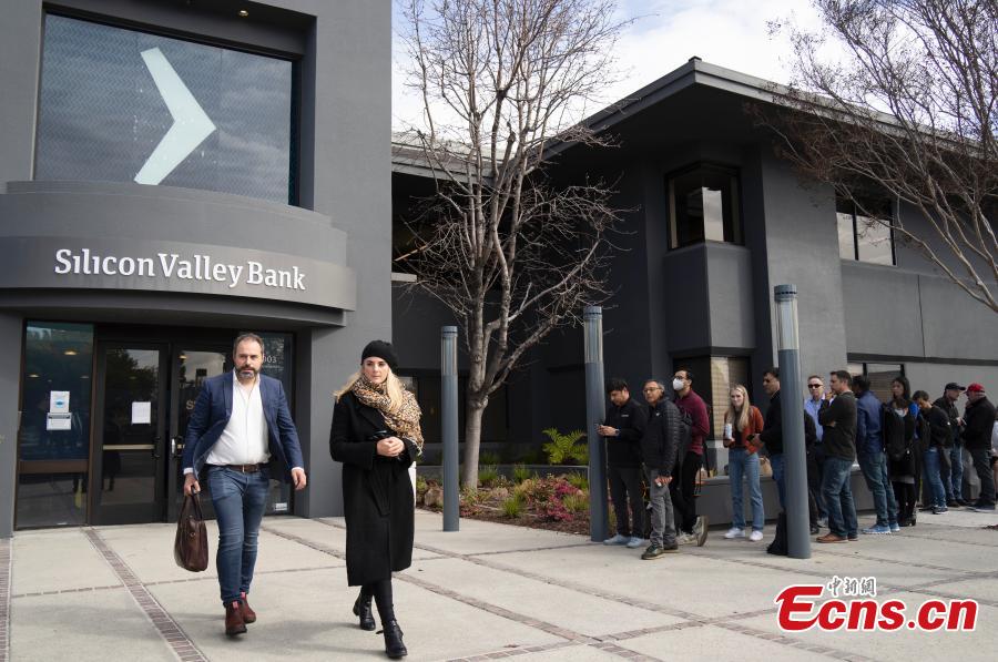Customers stand in line outside Silicon Valley Bank (SVB) headquarter to withdraw money in Santa Clara, California, U.S., March 13, 2023. (Photo: China News Service/Liu Guanguan)