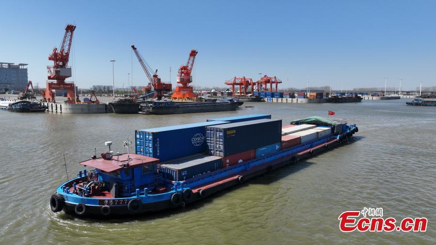 A container ship leaves Zhoukou Central Port in central China’s Henan Province, March 13, 2023. (Photo: China News Service/Zhao Lei)
