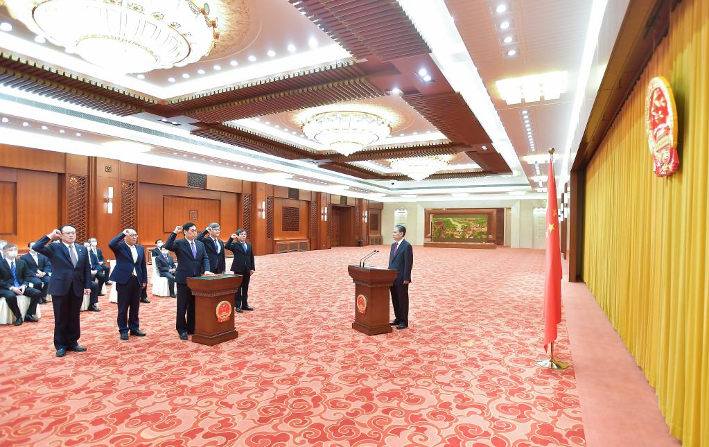 Liu Junchen, Guo Zhenhua, He Xin, Hu Xiaoli, and Ouyang Changqiong were appointed as deputy Secretaries-General of the 14th NPC Standing Committee at its first meeting. They also pledged allegiance to the country's Constitution, with the ceremony presided over and overseen by Zhao Leji.