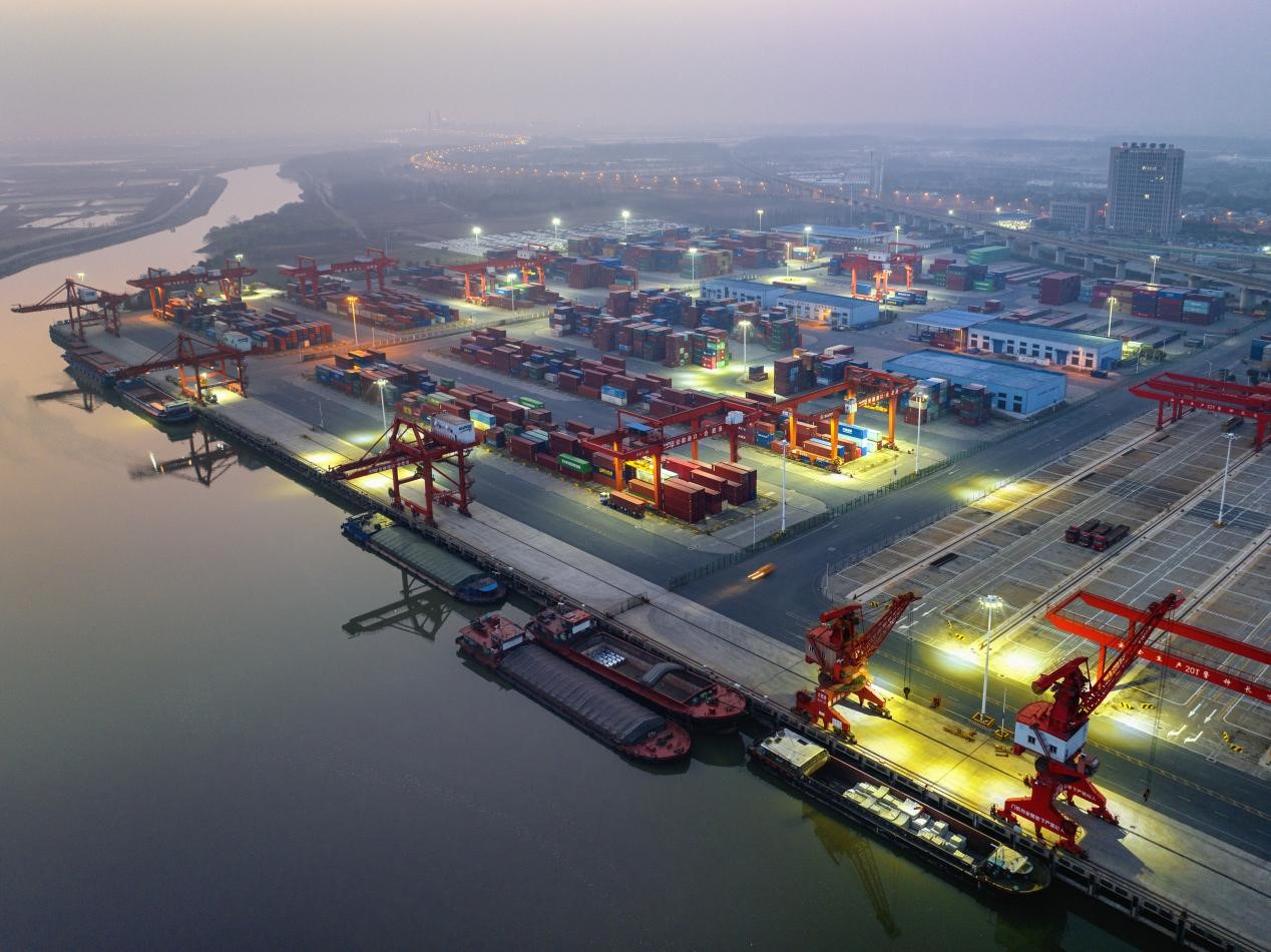Cargoes are loaded and unloaded at an international container terminal of the Hefei Port in Hefei, east China's Anhui province, March 5, 2023. (People's Daily Online/Miao Di)