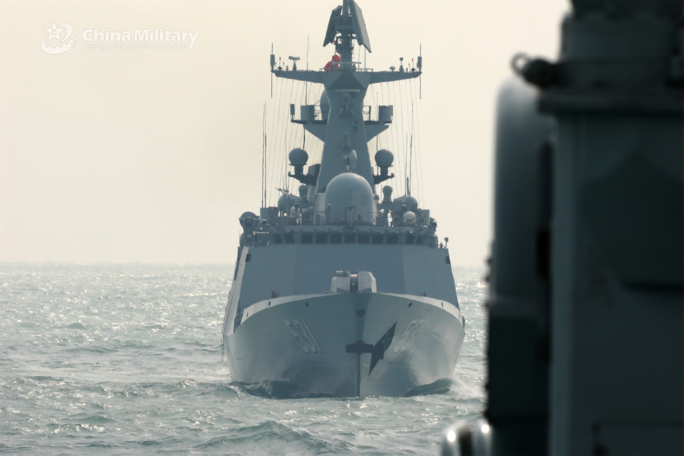 Two guided-missile frigates attached to a naval destroyer flotilla under the PLA Eastern Theater Command sail in formation during a multi-subject training exercise held in late February, 2023. (eng.chinamil.com.cn/Photo by Jiang Xia)