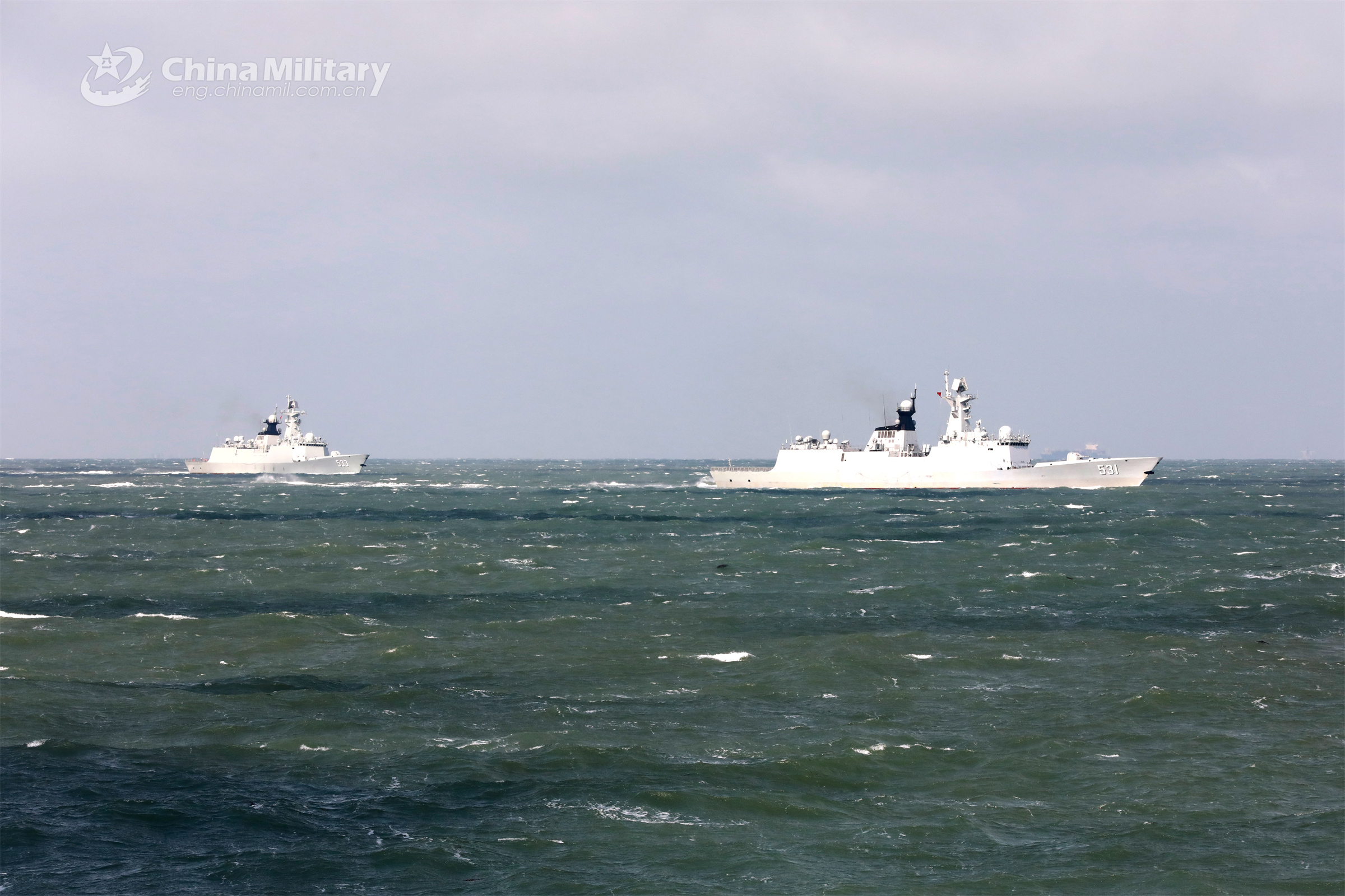 Two guided-missile frigates attached to a naval destroyer flotilla under the PLA Eastern Theater Command sail in formation during a multi-subject training exercise held in late February, 2023. (eng.chinamil.com.cn/Photo by Jiang Xia)