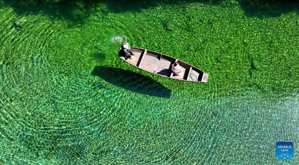 This aerial photo taken on March 14, 2023 shows a boat rides in the Pingshan canyon, a tourist attraction famous for its limpid water, in Hefeng County, Enshi Tujia and Miao Autonomous Prefecture, central China's Hubei Province. (Photo by Yang Shunpi/Xinhua)