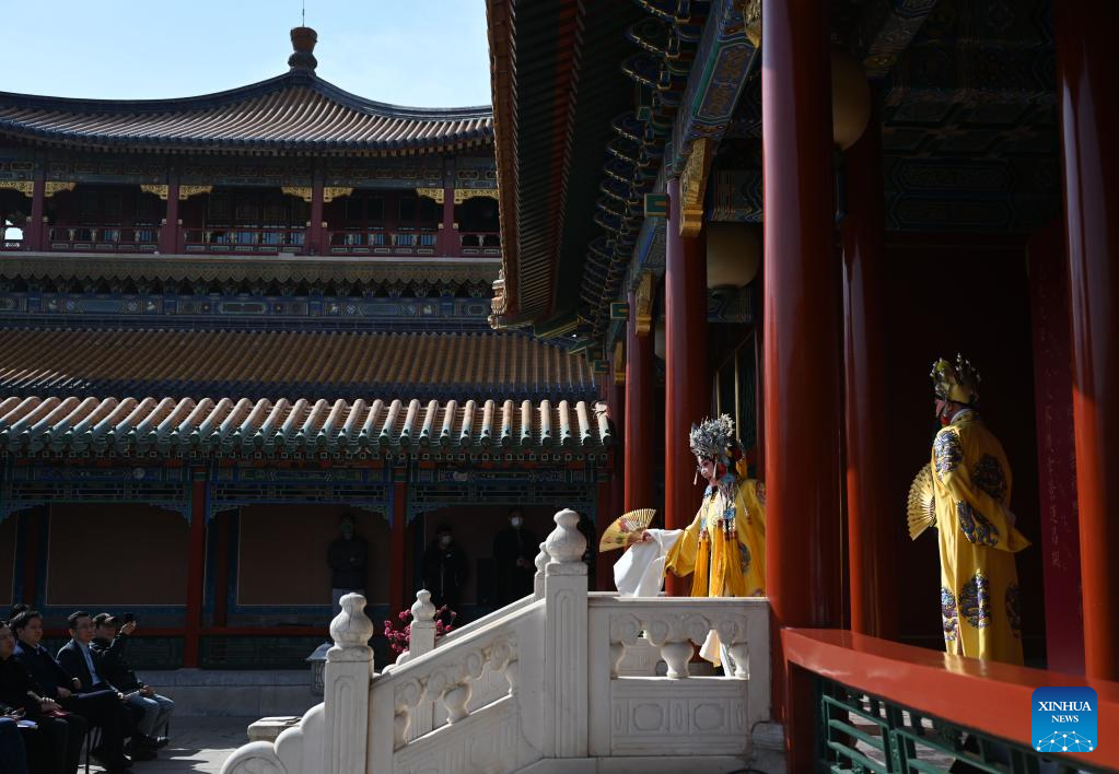 Kunqu opera performers Li An (2nd L) and Yu Bin enact in an excerpt of the traditional repertoire Palace of the Eternal Youth at the Palace Museum in Beijing, capital of China, March 13, 2023. The Palace Museum and Shanghai Kunqu Opera Troupe signed a strategic cooperation agreement here Tuesday to restage Chinese classic operas. (Xinhua/Jin Liangkuai)