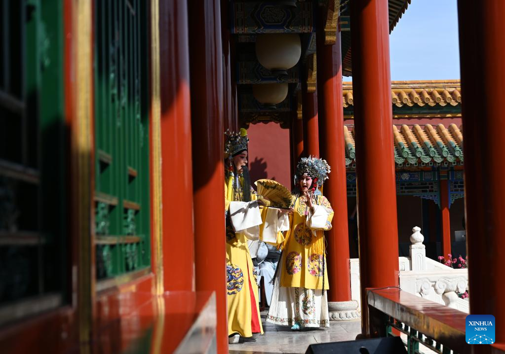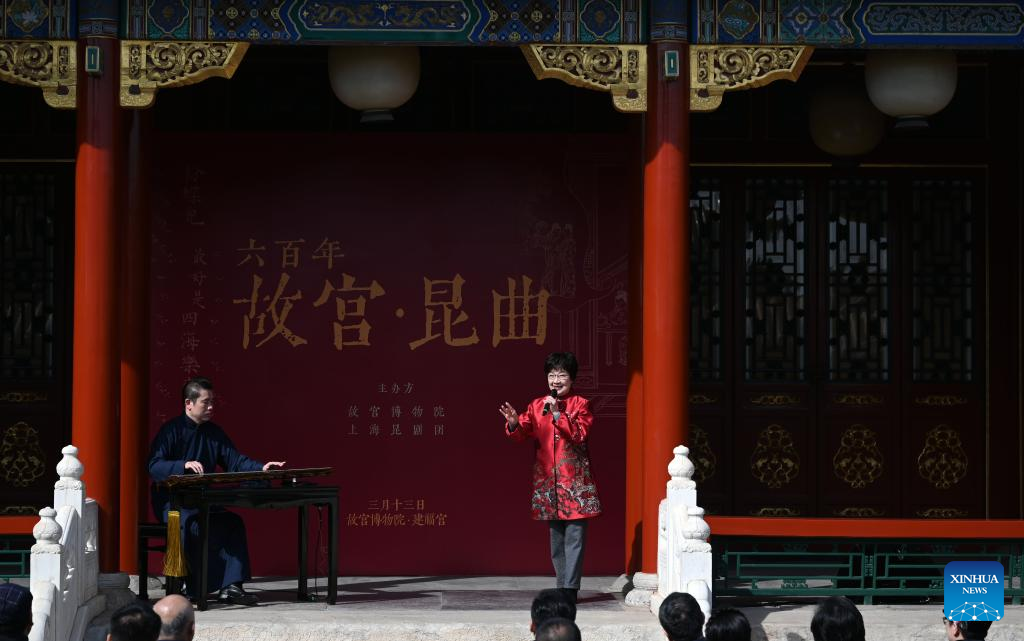 Kunqu opera performer Zhang Jingxian (R) and traditional Chinese musical instrument Guqin performer Yang Zhijian are seen during their performance of an excerpt of the Kunqu opera masterpiece The Peony Pavilion at the Palace Museum in Beijing, capital of China, March 13, 2023. The Palace Museum and Shanghai Kunqu Opera Troupe signed a strategic cooperation agreement here Tuesday to restage Chinese classic operas. (Xinhua/Jin Liangkuai)