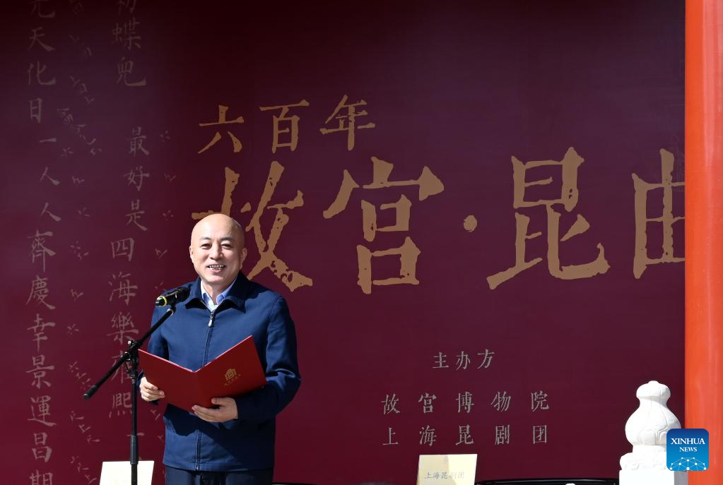Director of the Palace Museum Wang Xudong addresses the signing ceremony at the Palace Museum in Beijing, capital of China, March 13, 2023. The Palace Museum and Shanghai Kunqu Opera Troupe signed a strategic cooperation agreement here Tuesday to restage Chinese classic operas. (Xinhua/Jin Liangkuai)