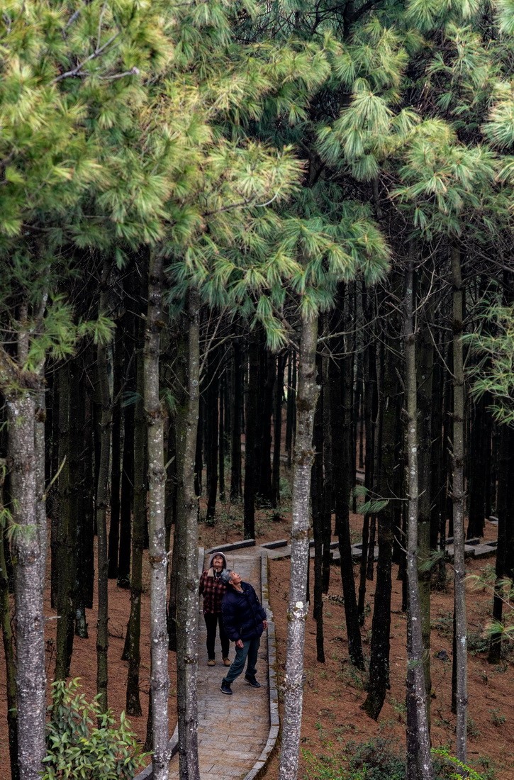 Wang Shigui, a ranger, and his wife walk along a trail to a lookout tower in Huamu mountain in Luliang county, Qujing, southwest China’s Yunnan Province, on March 12. (Xinhua/Jiang Wenyao)