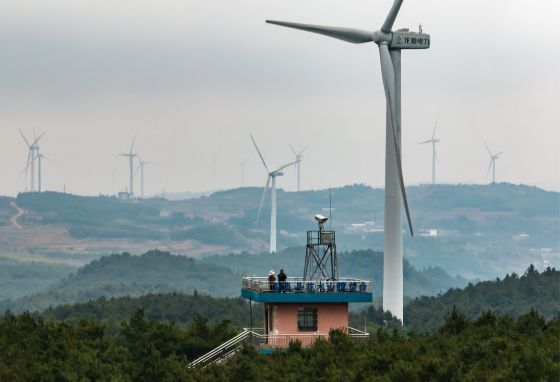 This aerial photo taken on March 12 shows Wang Shigui, a ranger, and his wife observing from a lookout tower in Huamu mountain in Luliang county, Qujing, southwest China’s Yunnan Province. (Xinhua/Jiang Wenyao)
