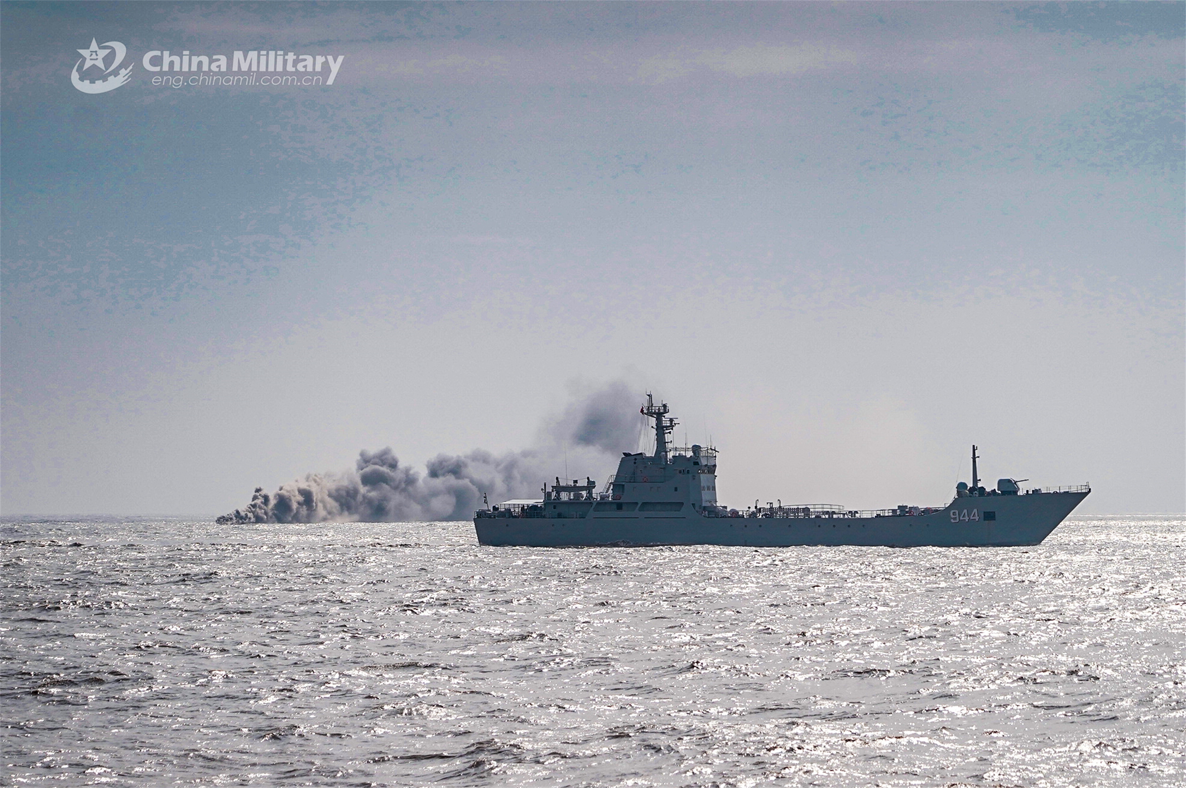 A landing ship attached to a landing ship group with the navy under the PLA Eastern Theater Command releases smoke screen during a maritime training exercise in early March, 2023. (eng.chinamil.com.cn/Photo by Li Hao)