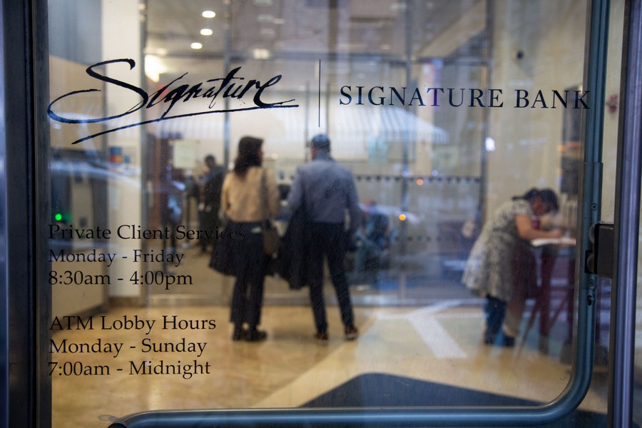 Customers wait inside a Signature Bank branch in New York, the United States, March 13, 2023. (Photo by Michael Nagle/Xinhua)