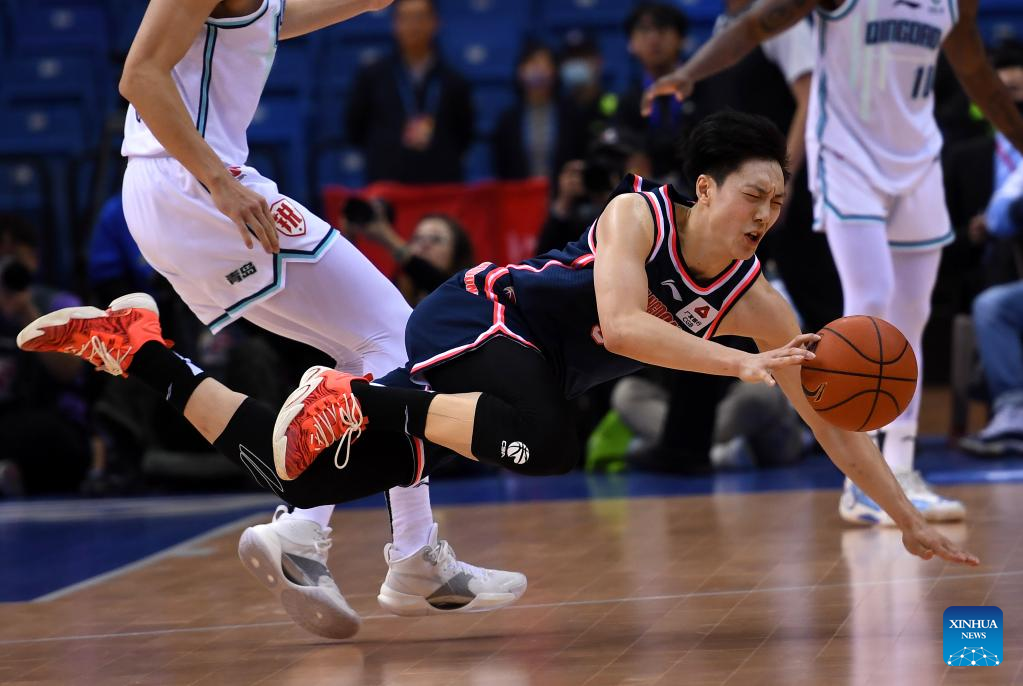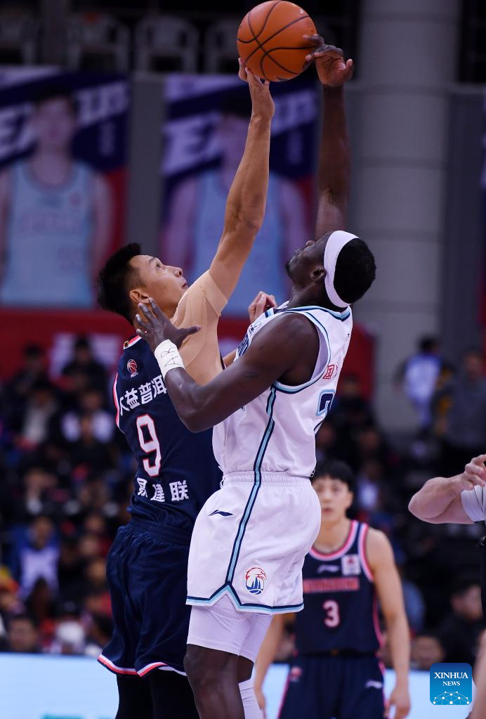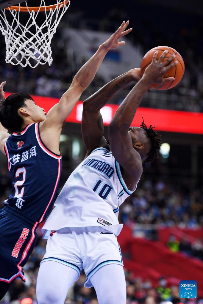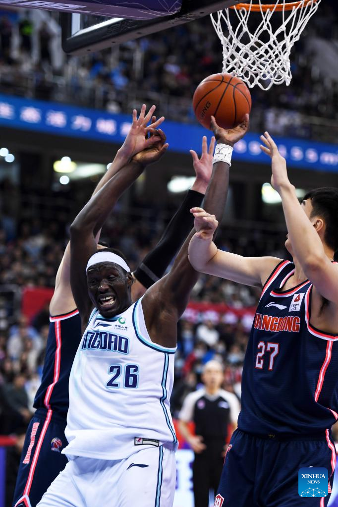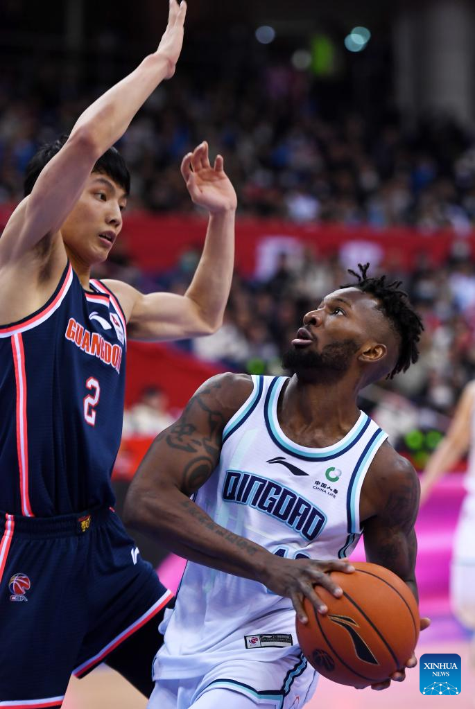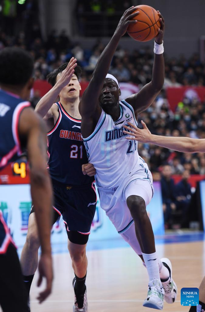 Duop Reath (L) of Qingdao Eagles vies for the ball during the 35th round match between Qingdao Eagles and Guangdong Southern Tigers at the 2022-2023 season of the Chinese Basketball Association (CBA) league in Qingdao, east China's Shandong Province, March 15, 2023. (Xinhua/Li Ziheng)