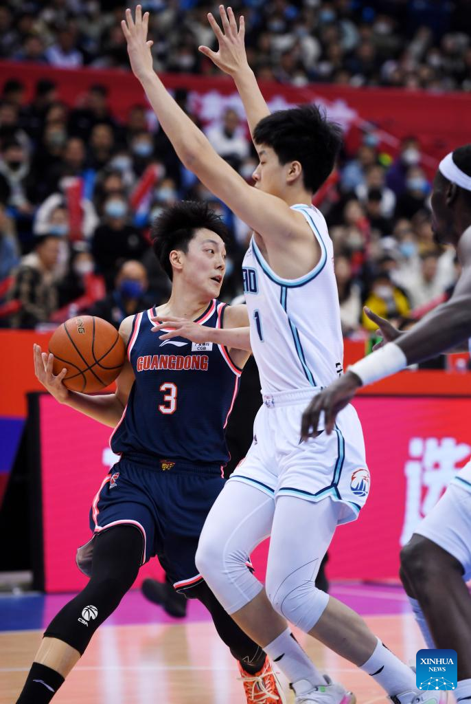 Hu Mingxuan (L) of Guangdong Southern Tigers prepares to pass the ball during the 35th round match between Qingdao Eagles and Guangdong Southern Tigers at the 2022-2023 season of the Chinese Basketball Association (CBA) league in Qingdao, east China's Shandong Province, March 15, 2023. (Xinhua/Li Ziheng)